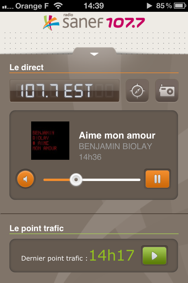 L’application est disponible sur Iphone, Ipad et Androïd. On regrette cependant de ne pas pouvoir écouter 107.7 FM sur ordinateur ; aucune trace des streaming live sur le net.