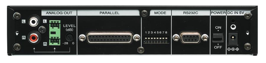 Les connexions de la face arrière sont les sorties audio asymétriques gauche et droite sur prises RCA (phono), les sorties audio symétriques gauche et droite sur connecteurs de type Phoenix, un connecteur D-sub 25 broches femelle de télécommande parallèle, un connecteur D-sub 9 broches femelle de télécommande série et une prise coaxiale pour l’alimentation CC. Les commandes de la face arrière sont l’interrupteur d’alimentation, le réglage de niveau de sortie audio et 8 mini-commutateurs DIP pour régler les divers modes de fonctionnement du lecteur.