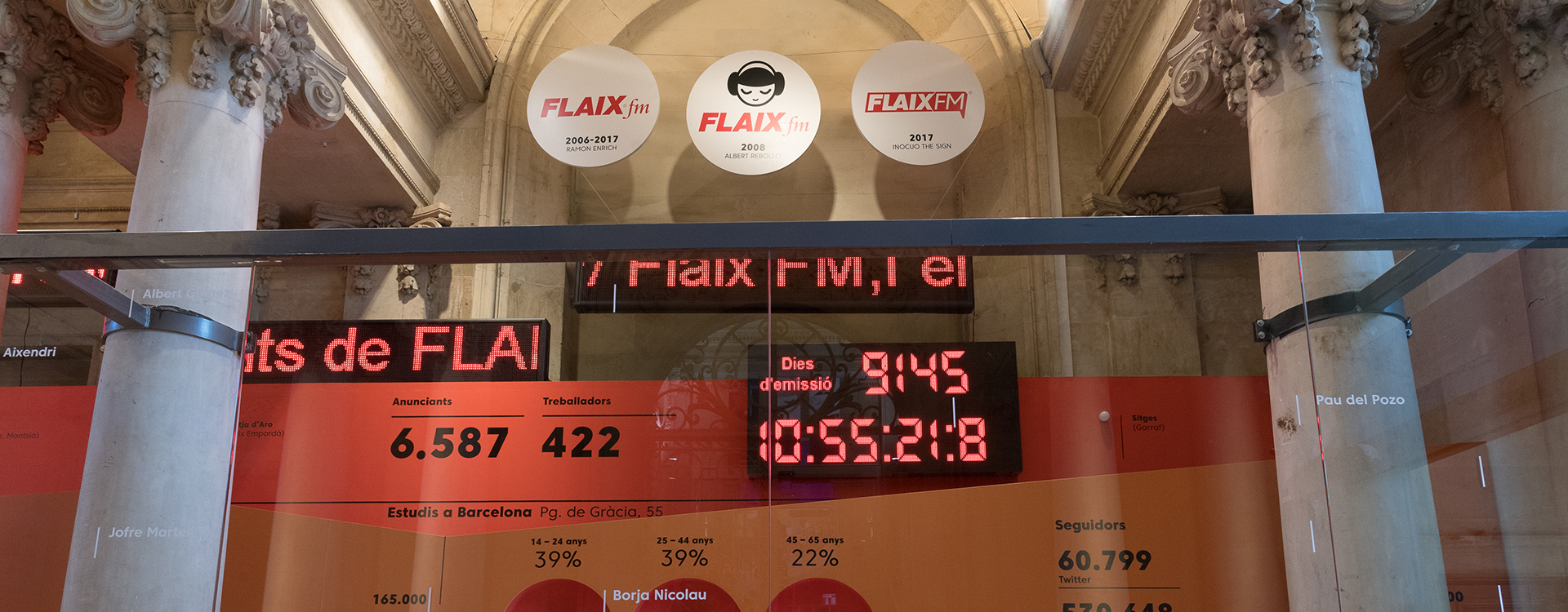 Évènement en Catalogne : Flaix FM (prononcer « Flash FM »), première radio dance catalane, à 25 ans. Fondée le 1er juin 1992 par Miquel Calçada et Carles Cuni, la station fête avec brio son anniversaire, et d’une manière inédite : via une exposition dans un musée ! Baptisée « Flaix 2042 », cette exposition, inaugurée par Neus Munté (conseillère à la présidence du gouvernement de Catalogne), a lieu au musée Palau Robert de Barcelone (1).