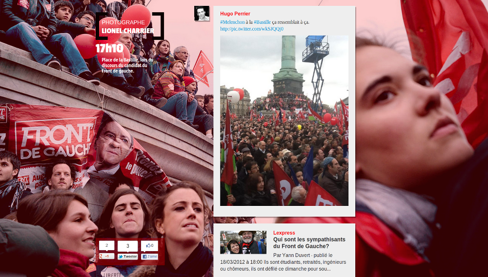 Le site, au design fluide signé par l’agence Upian, est agrégé par Storify. Rendez-vous donc sur : http://clichesdecampagne.franceinter.fr pour découvrir le premier chapitre consacré à la prise de la Bastille par Mélanchon.