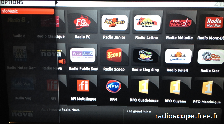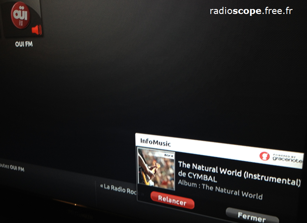 « Infomusic » fonctionne pour la télé… mais aussi pour la radio ! L’offre radio de la Freebox Révolution étant très riche, cela permet de connaître le titre diffusé sur toutes les radios. Certaines indiquent déja par défaut le titre en cours (via les flux internets repris par la Box), mais la majorité d’entre elles ne le font pas forcément, les réseaux nationaux en tête ! (ces dernières étant reprises du flux satellite par Free)