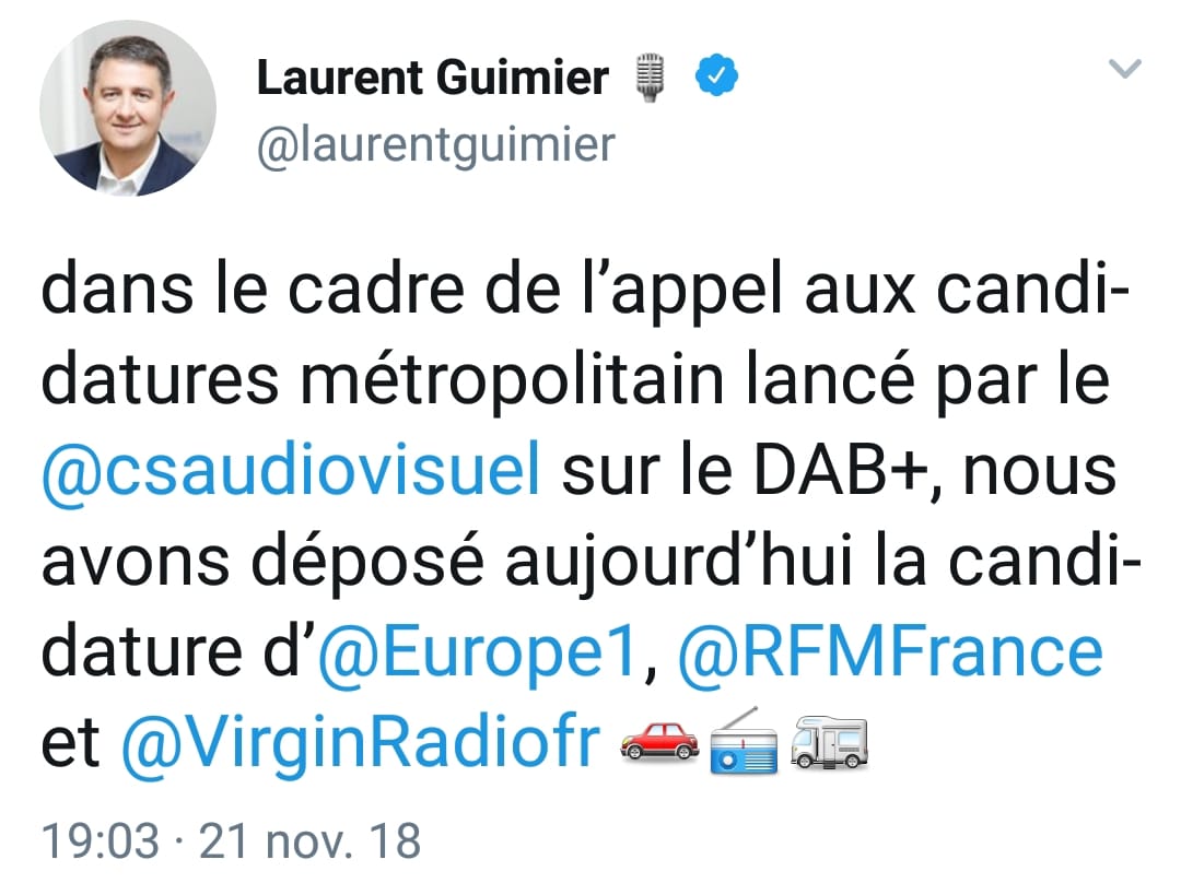 Une aubaine pour les radios qui souhaitaient un meilleur développement de leur réseau qu’en FM (on pense notamment à Ouï FM, Nova ou Radio FG), mais aussi pour les grands groupes qui auraient pu y avoir une place, alors qu’elles se sont toujours montrées hostiles à la radio numérique… Jusqu’à présent ! NRJ Group avait déjà surpris en postulant dans le récent appel à candidatures DAB+ pour le sud-ouest. Et suite à la clôture de l’appel métropolitain ce 21 novembre 2018, les autres groupes privés ont suivi.