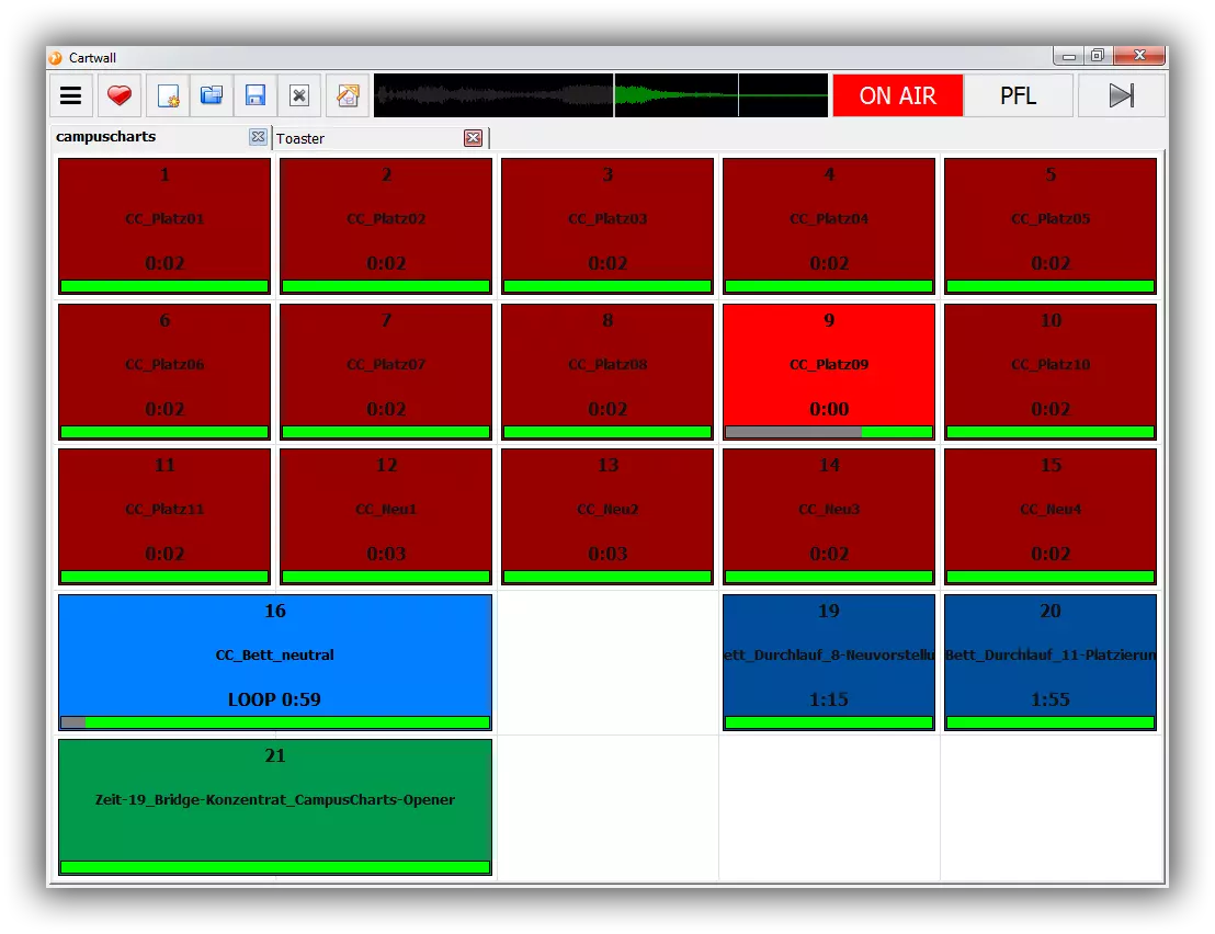 Le cartoucheur intégré peut être soit incorporé dans la fenêtre principale ou exécuter dans sa propre fenêtre, par exemple sur un deuxième moniteur. Il comporte un certain nombre, librement personnalisables, de petits lecteurs qui peuvent être utilisés pour la lecture de jingles, promos, etc… Par défaut, tous les players sont routés vers la même carte son, mais là encore, cela peut être modifié avec seulement quelques clics. Tous les players sont empilables et peuvent être reliés les uns aux autres par ce qu’on appelle les déclencheurs. Par exemple, lorsque vous démarrez une annonce vocale du player 2, vous pouvez faire un bed musical dans le player 1 en même temps.