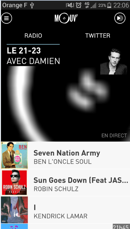 L’application permet naturellement d’écouter Mouv’ en direct, d’accéder aux podcasts (bien qu’il faut avoir téléchargé l’application « Radio France Podcast »), de consulter les derniers Tweets du compte de la radio, ou encore de contacter l’équipe directement par mail, de consulter les titres récemment diffusés et de visionner leurs clips.