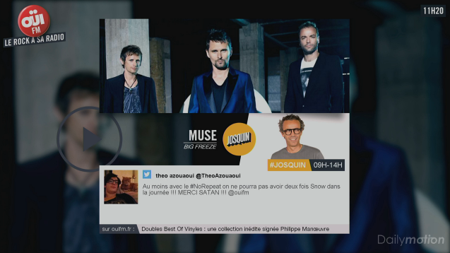 La web-tv est également intéractive, en relayant en temps réel les messages Facebook et Twitter de la radio. Lors des disques, pas de clips en simultané (on aurait bien aimé), mais de l’infographie avec le titre en cours, les dernières news de ouifm.fr, et les messages des réseaux sociaux.