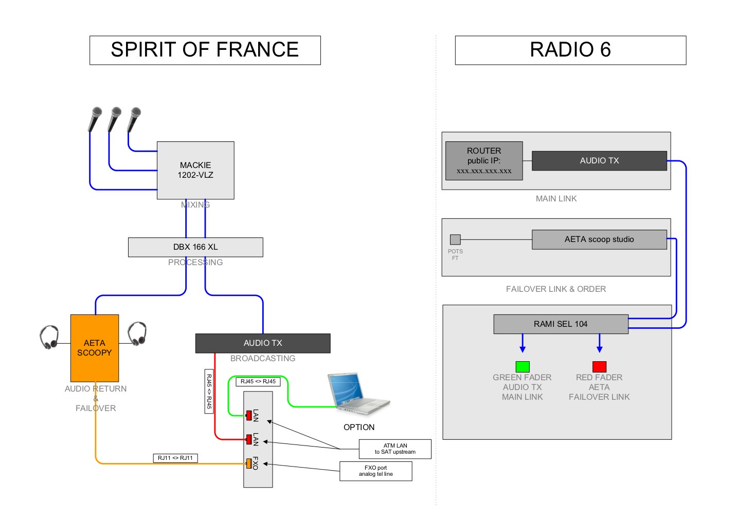 Pour des raisons de sécurité et aussi de délai, nous avons utilisé un port FXO à bord du navire, port qui « émule » comme sur une box, un canal téléphonique en SIP, propre à P&O et passant par Douvres. Ainsi, les liens BATEAU vers STUDIO et inversement étaient séparés, même si le SAT était utilisé dans les deux cas. Cette liaison a été établie avec un Scoopy AETA audio. Donc Nico et Rénald avaient un retour téléphonique avec un délai, petit, mais délai qd même. Le scoopy a par ailleurs géré les retours casques (TX et RX). Il était donc alimenté par un FEED qui gérait en même temps le départ STL-IP vers le SAT.