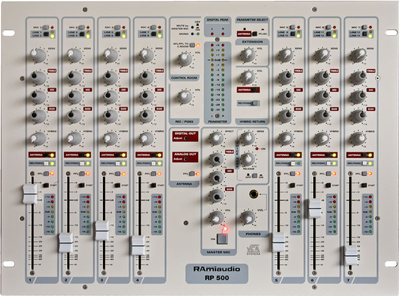 La RP500 est pourvue d’une voie spécifique pour l’animateur principal avec son correcteur de tonalité, son départ vers l’hybrid et un bouton ON/OFF d’ouverture rapide. Un panneau ON AIR lumineux peut être commandé par cette voie d’entrée. La section spécifique pour l’hybrid extérieur permet l’envoi à partir de chaque entrée, le retour correspondant est affectable, soit sur l’antenne, soit sur la deuxième sortie, soit les deux à la fois.