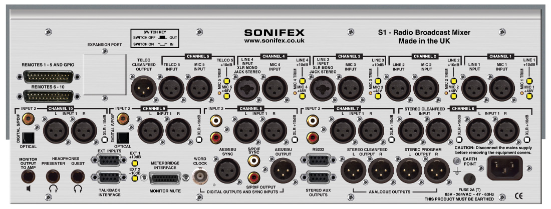 La S1 Sonifex est une console de mixage compacte, économique, de format fixe conçue pour l’emploi en radio hertzienne. Elle peut être encastrée dans un bureau ou montée en rack grâce à l’ajout d’équerres de rack optionnelles. Avec un jeu complet de fonctions, elle offre une solution appropriée aux besoins d’une radio communautaire, éducative ou estudiantine qui demande une console de mixage polyvalente et fiable pour la radiodiffusion. Elle a une approche de « qualité sans compromis », mais offre un fonctionnement simple et fiable.