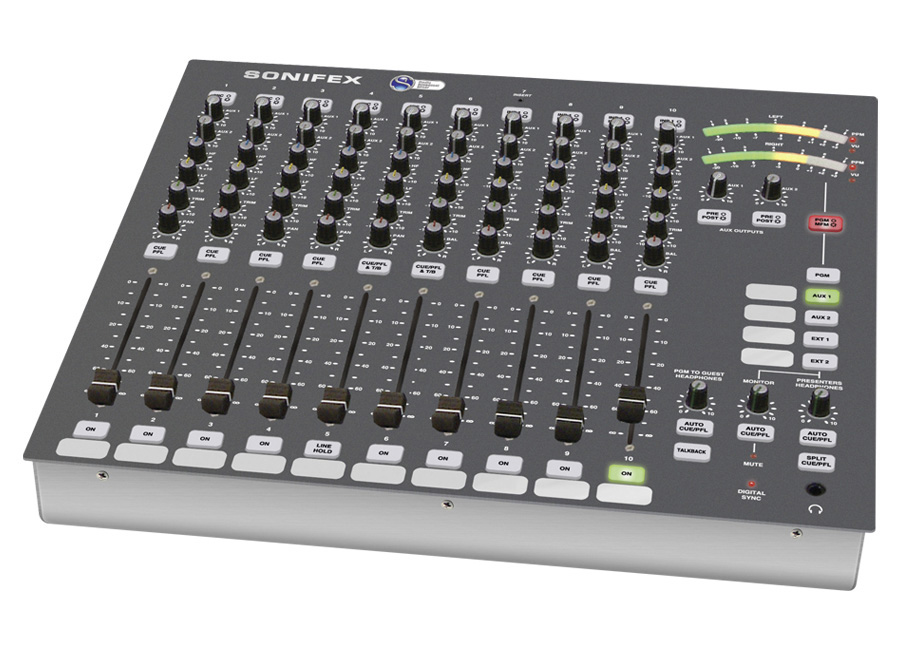 La face avant a dix tranches de commandes pour les dix canaux d’entrée. La rangée supérieure des commandes contient les touches de sélection de source qui s’allument si la seconde option est choisie. Les voies une, deux et cinq sont des voies mono et ont en haut des touches de sélection microphone/ligne pour les deux premières, et microphone/téléphone pour la voie cinq. Les voies trois et quatre ont des touches de sélection microphone/ligne ; l’entrée ligne peut être stéréo ou mono, selon le connecteur utilisé. Les voies six à dix sont des voies stéréo ; les commutateurs de sélection offrent le choix entre entrée une et entrée deux, exceptée la voie six qui propose l’entrée une ou l’entrée de source « clean feed », pour l’emploi dans des applications telles que CODECS ISDN ou liaison de deux studios. La rangée de boutons suivante se compose de faders rotatifs pour le départ auxiliaire un. La rangée suivante concerne le départ auxiliaire deux. Ensuite vient une rangée de boutons rotatifs offrant plus ou moins 7 dB d’amplification ou atténuation des hautes fréquences, puis dix boutons offrant la même amplification ou atténuation mais pour les basses fréquences. Chaque voie a ensuite des commandes de niveau offrant plus ou moins 12 dB de gain, suivies de commandes de panoramique pour les voies mono et de balance pour les voies stéréo. Une rangée de touches de tops ou d’écoute pré-fader qui se verrouillent et s’allument à la sélection sauf les voies cinq et six qui offrent tops/écoute pré-fader (PFL) avec talkback. En avant-derniers se trouvent dix faders de 100 mm qui pilotent un circuit VCA pour la fiabilité et un bon suivi stéréo, suivis d’une rangée de touches de voie « ON », qui se verrouillent et s’allument quand on les presse, sauf la voie cinq qui « maintient » la ligne de téléphone par commande à distance depuis un hybride téléphonique externe (non inclus). La voie 7 a aussi une prise mini-jack 3,5 mm pour la reproduction depuis un lecteur mp3 ou dispositif similaire.