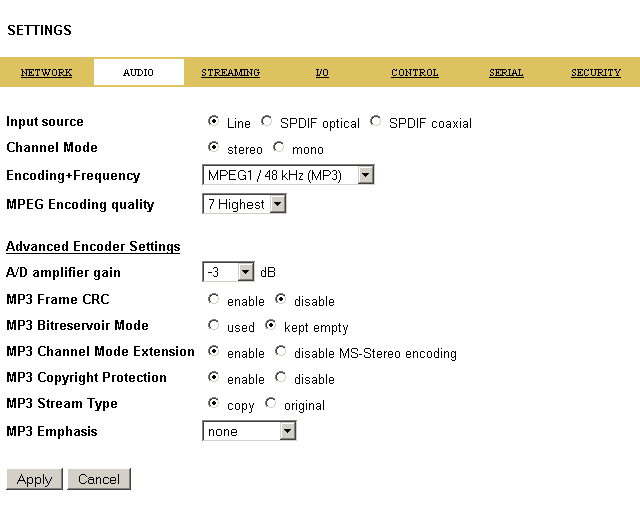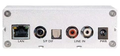 Encodeur audio via IP avec entrées audio niveau ligne et S/PDIF, faible consommation, support MP3 et PCM, u-law et a-law. Support Multicast et fonctionnement comme source shoutcast.