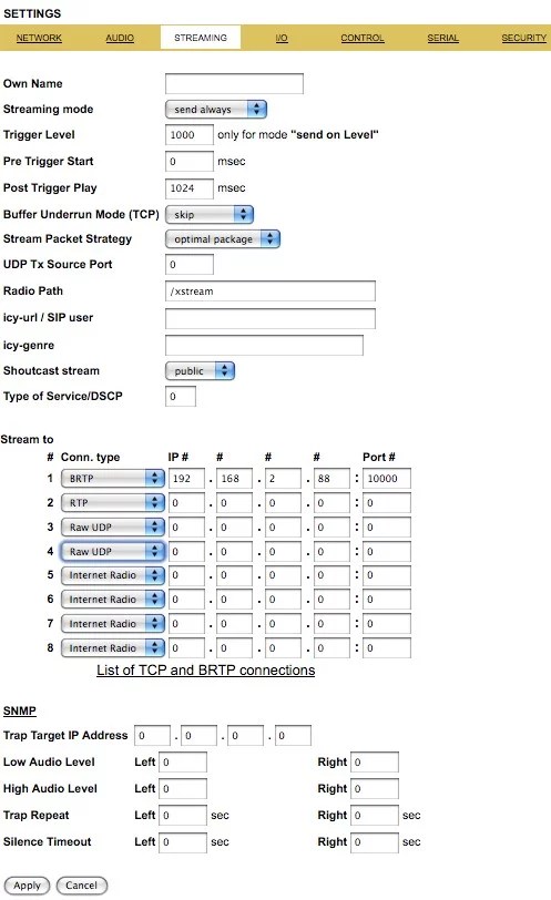 - Encodeur IP audio générique avec source shoutcast/icecast, génération de métadonnées, incluant les interfaces streaming TCP, RTP, shoutcast, HTTP, multicast