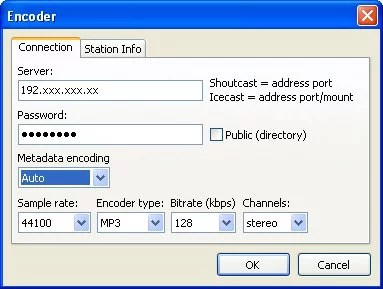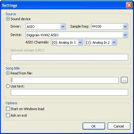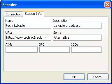 - Sélection du bitrate de votre station, de la source audio (périphérique ou une URL) et de la source titre de la chanson.