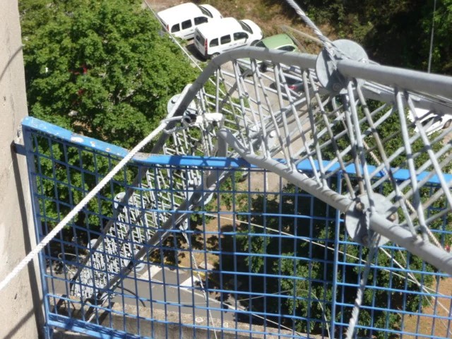 ‘émetteur, placé sur le toit de l’unité d’habitation « Le Corbusier » (ou sont basés également les studios de la radio) n’a pas résisté aux fortes rafales de vent, et s’est retrouvé couché, à moitié dans le vide. La barrière de sécurité du toit à ainsi été pliée.