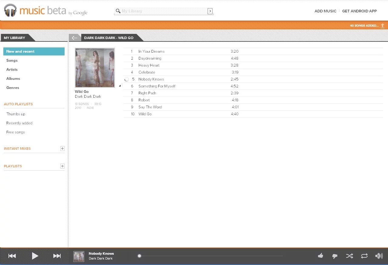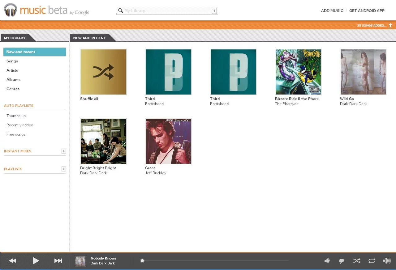Après quelques paramétrages, vous accédez à un service de stockage pour votre discothèque intégrant un player. Google Music permet de gérer jusqu’à 20000 titres !!! Le service rêvé, votre discothèque disponible n’importe où avec possibilité de créer des playlists et de naviguer via une interface moderne, sympathique et très fluide.