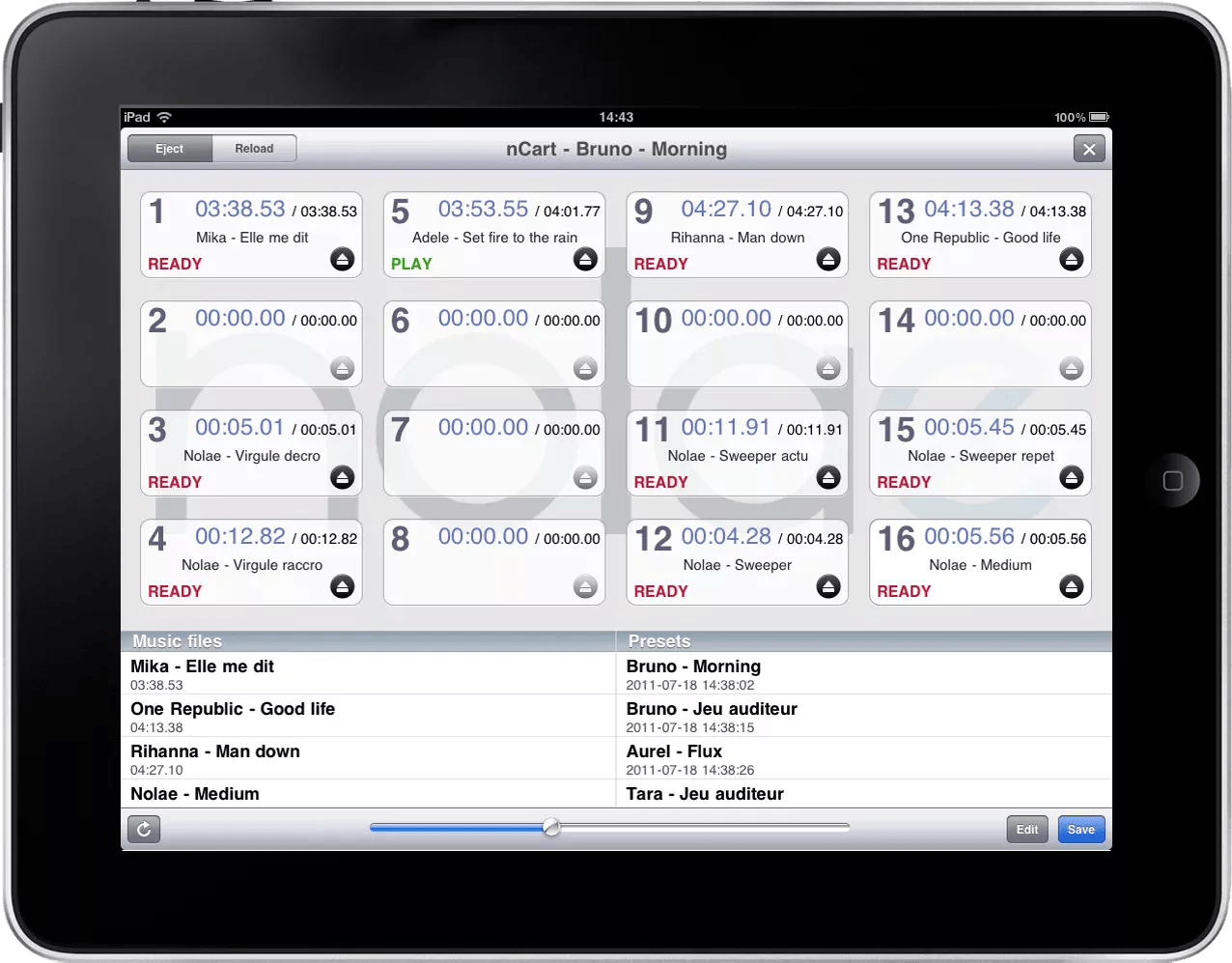nCart est la première application radio à destination à la fois du grand public, des professionnels de la radio et du broadcast. Disponible sur iPad, nCart est un cartouchier 100% tactile. Il permet de lancer tous les sons présents sur l’appareil. De nombreuses fonctions habituelles des autres cartouchiers sont disponibles, auxquelles Nolae a rajouté notamment la possibilité de remplir à l’avance des cartouches et de les enregistrer dans la colonne « Presets », d’utiliser l’iPad en mode portrait ou paysage, et dès la sortie d’iOS5, une synchronisation de l’appareil et de la liste des sons en toute transparence pendant l’utilisation de l’application.