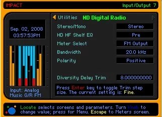 Le traitement pour Radio/netcast numérique (DR) est maintenant livré d’usine. Nous avons augmenté le taux d’échantillonnage à 64 khz, ainsi le rendement du DR peut aisément fournir la largeur de bande audio de 20 khz pour ceux qui le préfèrent. D’ailleurs, 8 secondes de retard sur la sortie analogique améliore énormément la polyvalence d’installation par radio HD, vous libérant de la nécessité d’employer une ligne à retard dans le pilote radio HD. Ceci vous permet d’employer le codeur stéréo intégré du 8500 et le limiteur MPX pour alimenter l’émetteur analogique FM.