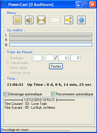 PowerCast est un logiciel permettant l’envoie d’un flux vers un serveur de streaming (type Shoutcast, Icecast …). Il permet de récupérer les titres en cours et à venir avec une intégration simplifiée pour Raduga, ZaraRadio et DRS 2006.