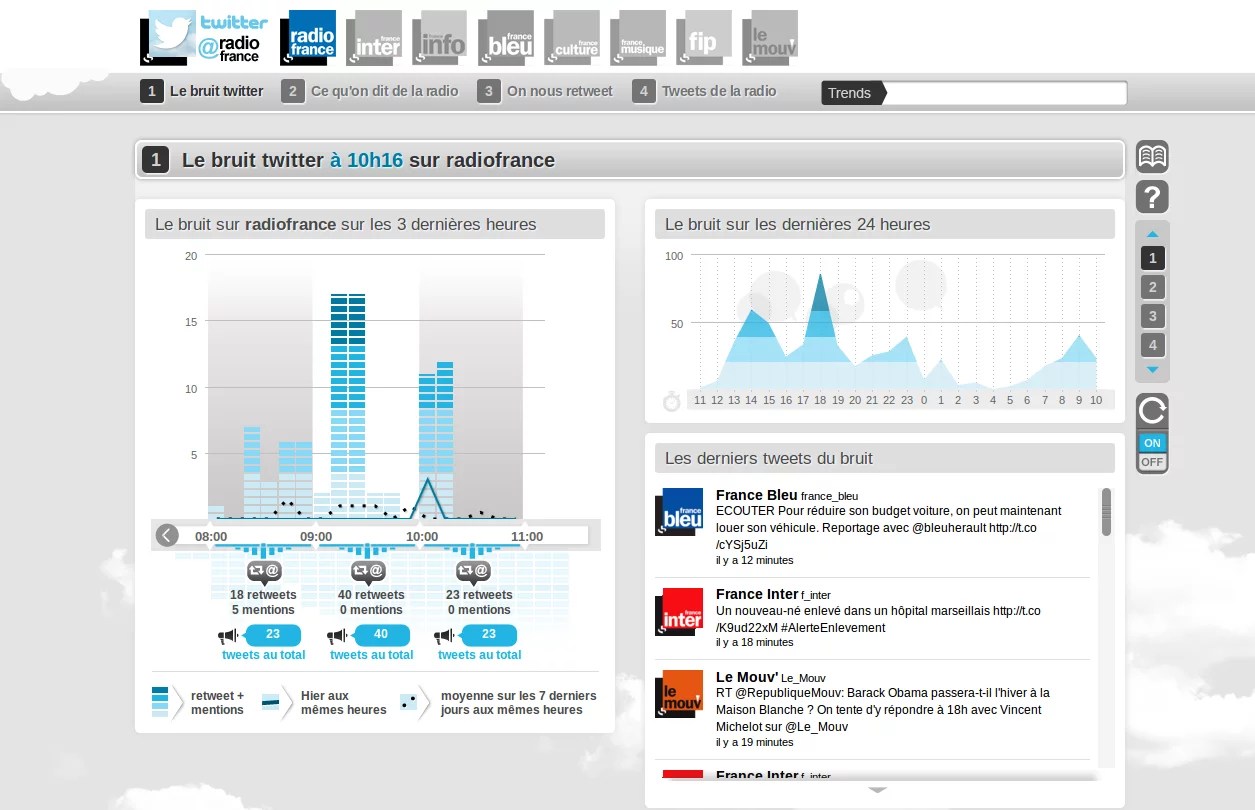 Radio France met sa console twitter à disposition du public qui peut consulter en temps réel les mesures pour chaque radio. Si d’autres radios ont développé un outil similaire, Radio France est le premier à rendre l’ensemble accessible au public.