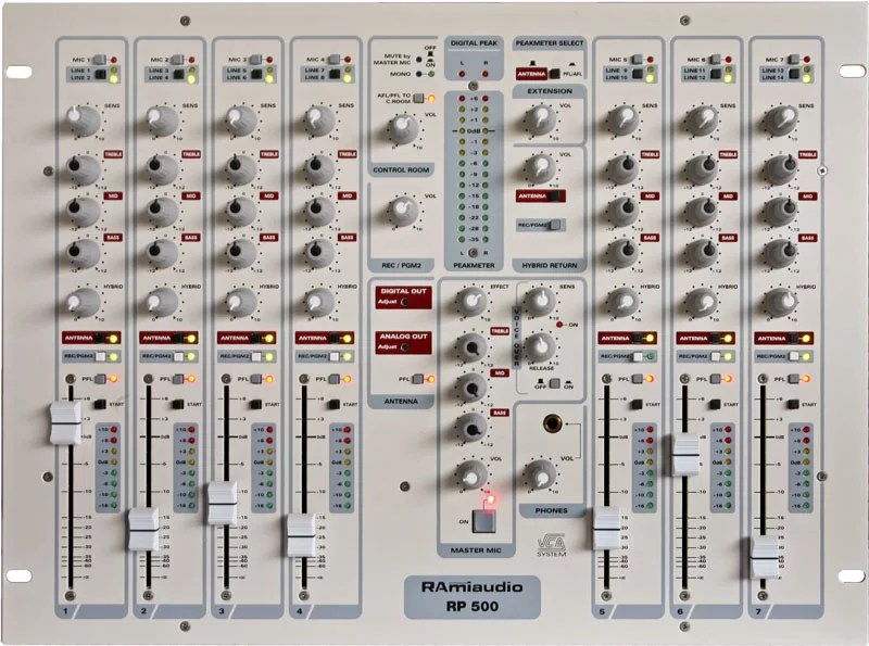 La RP500 est pourvue d’une voie spécifique pour l’animateur principal avec son correcteur de tonalité, son départ vers l’hybrid et un bouton ON/OFF d’ouverture rapide. Un panneau ON AIR lumineux peut être commandé par cette voie d’entrée. La section spécifique pour l’hybrid extérieur permet l’envoi à partir de chaque entrée, le retour correspondant est affectable, soit sur l’antenne, soit sur la deuxième sortie, soit les deux à la fois.