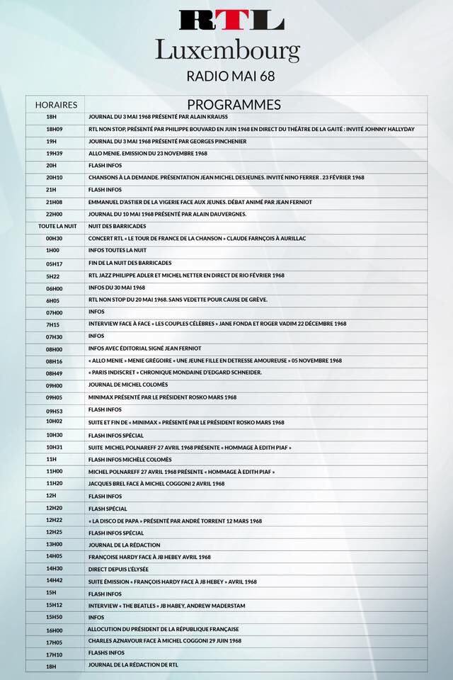 Mais ce qui est à retenir, c’est que RTL propose une webradio spéciale qui fait revivre RTL, telle qu’elle était, en mai 1968 ! Durant 24 heures, RTL Radio 68 diffuse de nombreuses archives de la station. L’occasion d’écouter les actualités et quelques émissions d’époque en entier : « RTL Non-Stop » de Philippe Bouvard avec Johnny Hallyday, « Allô Ménie » de Ménie Grégoire, « Minimax » du Président Rosco, « La disco de papa » d’André Torrent, mais aussi des interviews de Charles Aznavour, Michel Polnareff, Françoise Hardy, Jacques Brel, ou les Beatles.
