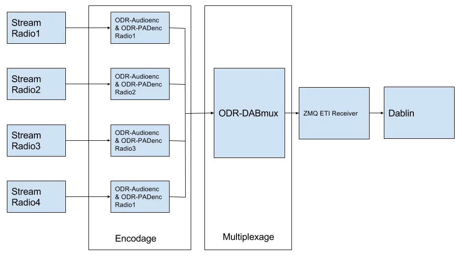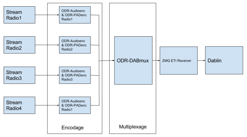 Votre « multiplexeur » est prêt ! Les flux de vos 4 radios sont encodés par ODR-Dabenc et multiplexés par ODR-Dabmux. ODR-Dabenc et ODR-Dabmux sont lancés automatiquement. Vous pouvez controler leurs statuts via supervisor. Vous avez maintenant un seul flux au format ETI contenant les flux audio des radios et leurs data sur le port 18081.
