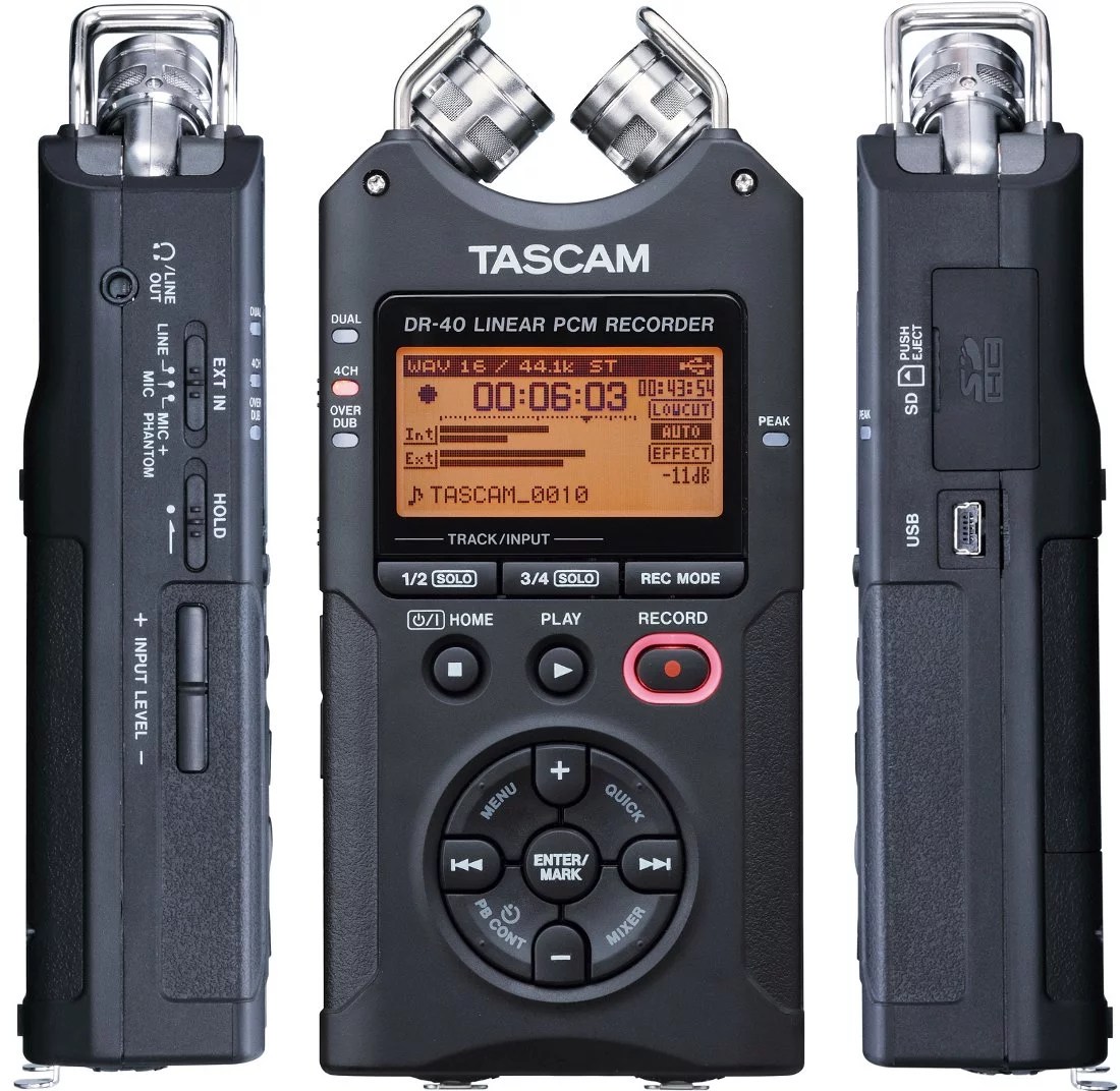 Le Tascam DR-40 est un enregistreur portable 4 pistes intégrant des micros statiques orientables, des entrées micro sur XLR et assurant une longue autonomie sur piles. Il s’emmène n’importe où, et enregistre jusqu’à 4 pistes, depuis ses micros incorporés, des microphones externes ou des sources de signal au niveau ligne. Les microphones intégrés, de haute qualité, sont orientables en configuration XY ou AB, ce qui permet d’optimiser la prise de son en fonction des particularités de la source. Les préamplis Tascam intégrés permettent d’alimenter des micros statiques externes (alimentation fantôme), pour une haute qualité d’enregistrement, servie par une résolution de 24 bits/96 kHz. Le DR-40 accepte des connecteurs XLR ou jack 6,35 mm symétriques, grâce à ses entrées sur Combo Neutrik verrouillable. Il enregistre sur carte SD ou SDHC (capacité maximale : 32 Go), et il est livré avec une carte de 2 Go.