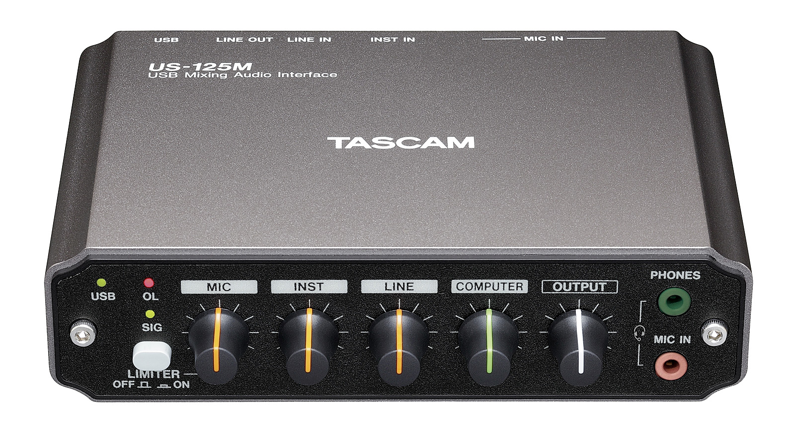 L’interface US-125M possède quatre entrées, munies de réglages de niveau dédiés : une entrée micro (symétrique sur le panneau arrière, sur connecteur Combo mixte XLR/jack TRS, ou asymétrique en face avant, sur mini-jack), avec limiteur commutable et indicateur de présence/saturation du signal ; une entrée guitare (sur jack 6,35 mm standard) ; une entrée ligne stéréo (sur connecteurs RCA/cinch) ; et une entrée stéréo recevant un flux audio depuis l’ordinateur via USB. Alimentée par le port USB, l’interface audio possède un solide boîtier aluminium, et peut aussi s’utiliser de façon autonome, comme simple mixeur.