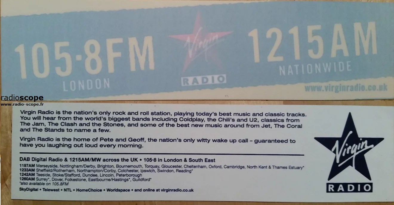 Virgin Radio fut lancée le 30 avril 1993 sur ondes moyennes (le 1215 kHz) ainsi qu’en FM à Londres sur le 105.8 avec pour premier titre « Born to be wild » repris par INXS. Elle fut parmi les premières radios nationales commerciales du Royaume, avec Classic FM et Talk Radio notamment. La radio avait échouée à obtenir un réseau FM national, la partie 105.0-108.0 de la FM anglaise venant alors d’être libérée pour des radios privées régionales. Elle rejoint naturellement la radio numérique au début des années 2000, lui assurant une diffusion nationale avec un bon confort d’écoute.