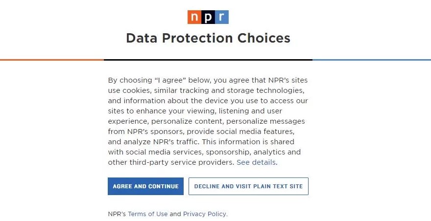 Actuellement, seuls les radios hébergées par radio.com (notamment les radios de CBS) sont les principales concernées. Plus original, la radio publique NPR ne bloque pas l’accès à son site npr.org, mais demande au visiteur avant d’y accéder son consentement pour la collecte de données. S’il refuse, il se retrouvera avec une version texte HTML du site !