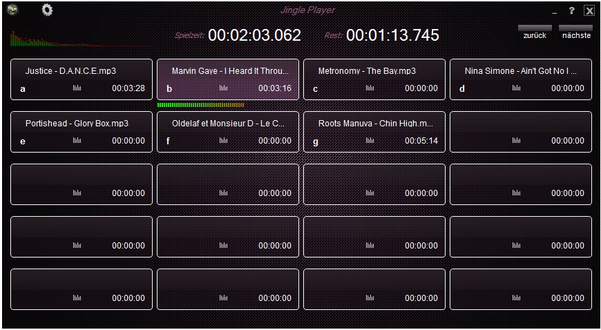 vbSolution présente son nouveau cartoucheur Jingle Player, actuellement en version béta. 20 cartouches par « écrans », soit 40 cartouches en accès rapide. La navigation entre les 2 écrans s’effectue par les boutons : « zurück » et « nächste ».