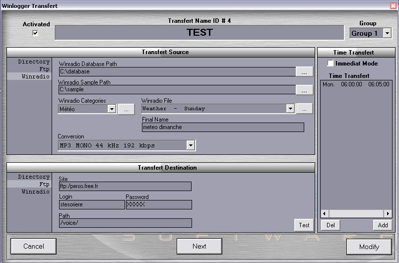 WinTransfer est une application dédiée au transfert de sons via internet et des serveurs FTP. Elle permet de faire des scénarios de ces transferts sous tous les formats standards du marché: Mp2, Mp3, Wav, G711, Wma… Le transfert est possible d’un répertoire local ou directement de la base de données de WinMedia ou de WinLogger, vers un répertoire située sur le FTP.