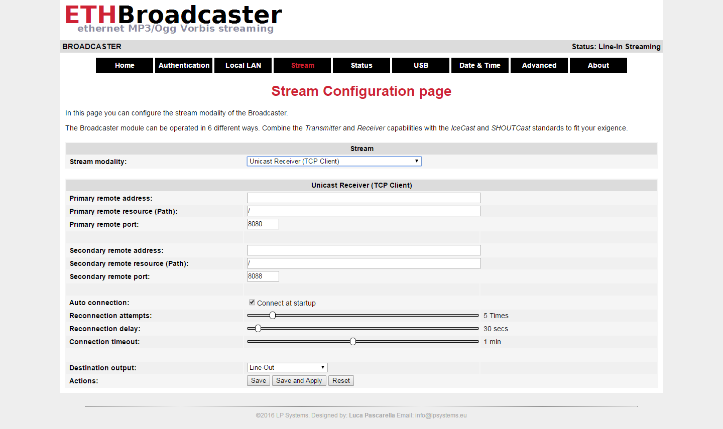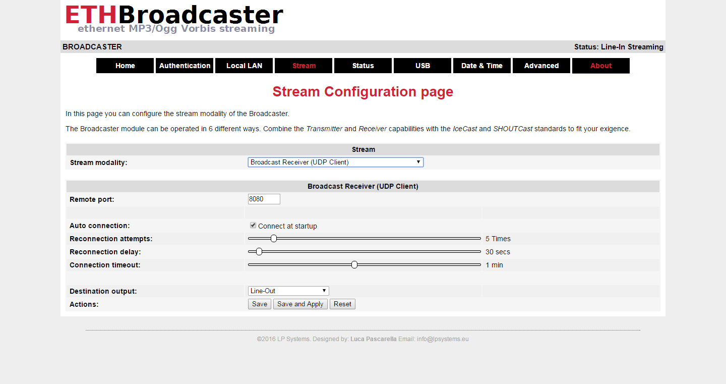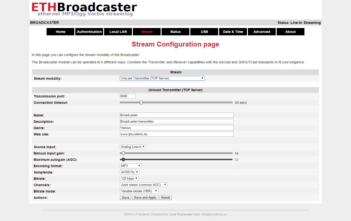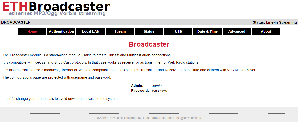 L’Ethernet Broadcaster peut fonctionner comme un « client » intégré pour diffuser le signal audio numérique transmis par IP. Il s’agit d’un périphérique conçu pour prendre en charge l’ audio compressé MPEG-1 Layer 3 et Ogg Vorbis . L’encodage et le décodage ont lieu en temps réel par le processeur DSP et le signal de sortie est à la fois en forme numérique (USB) et analogique (mini-jack). Toutes ces fonctionnalités vous permettent de connecter rapidement et sans effort un système audio à Internet. Développé avec la pensée de la facilité d’ utilisation , l’Ethernet Broadcaster peut être géré par un navigateur Web standard, à partir de: PC, PDA, Smartphone, etc..