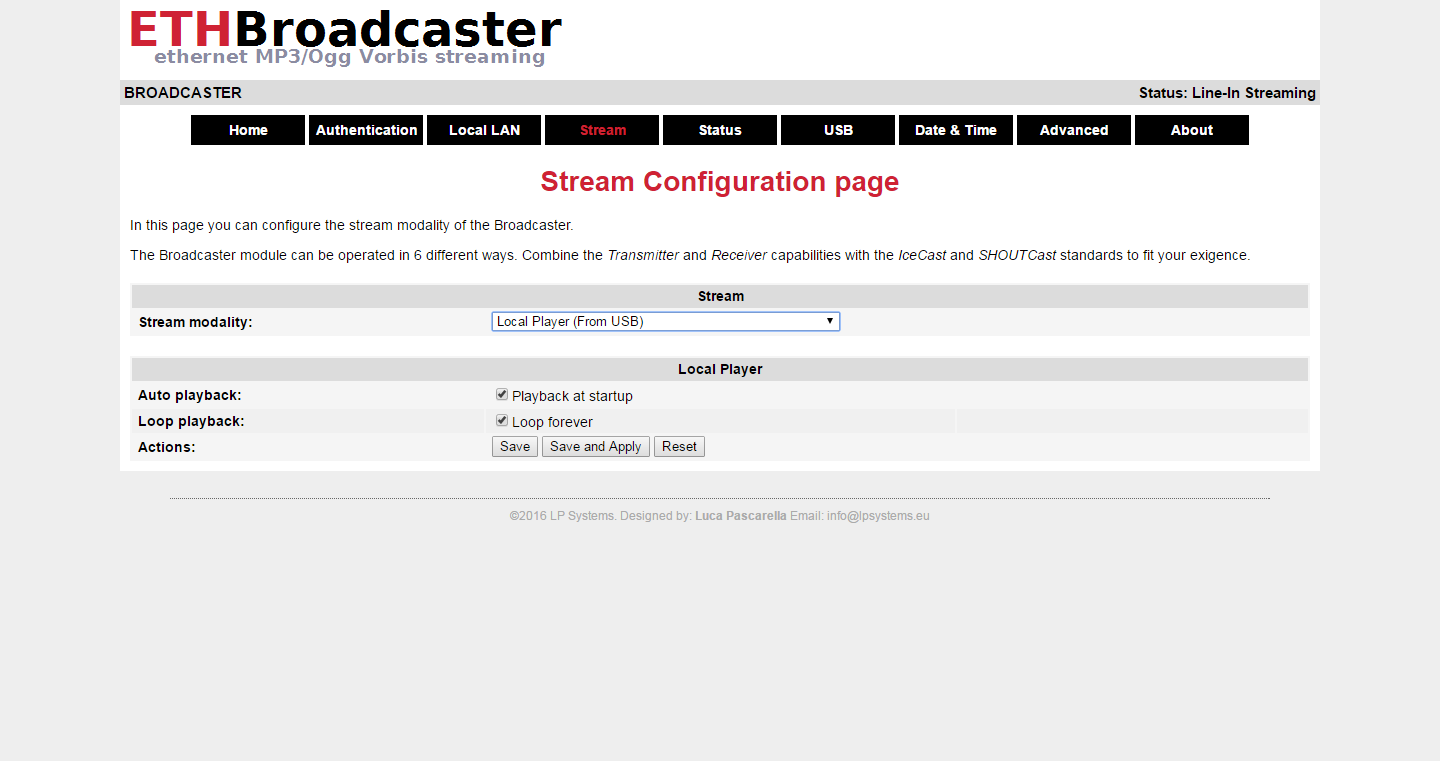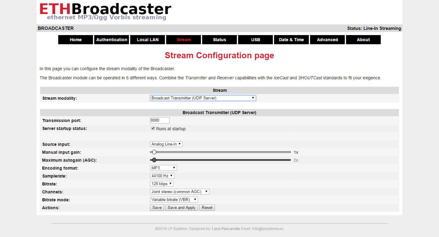 A noter que l’Ethernet Broadcaster peut être utilisé pour différentes applications. Le choix se fait via l’interface dans l’onglet « Stream » et dans la section « Stream modality » :