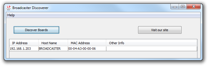 On commence par relier l’Ethernet Broadcaster au réseau via la prise RJ45, on alimente et lance l’utilitaire BroadcasterDiscovwerer.jar afin de découvrir l’ip de la carte :