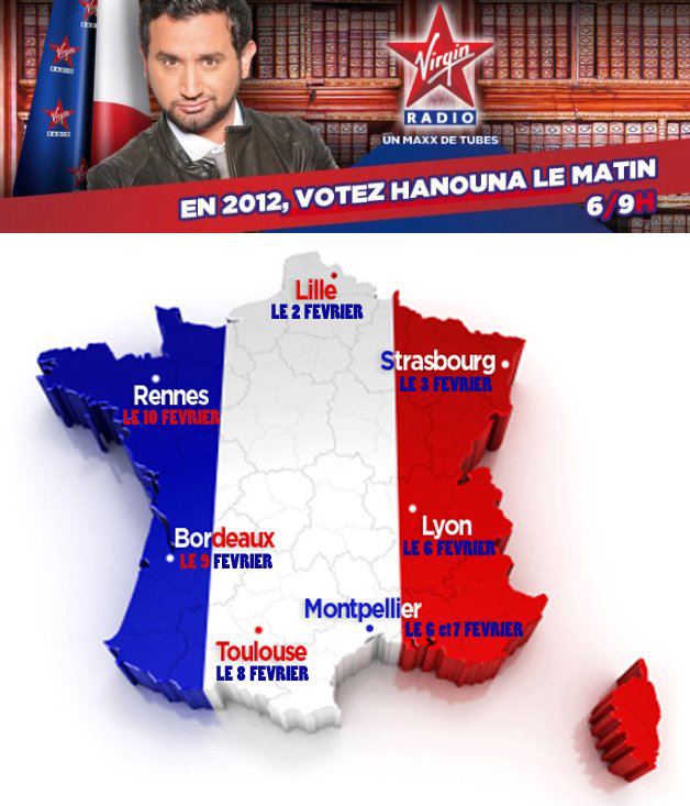 Dans sa matinale de Virgin Radio, Cyril Hanouna fait voter ses auditeurs le matin pour « Hanouna le matin ». Et il se lance en campagne pour obtenir encore plus de votes ! Du 2 au 10 février, la matinale se délocalisera ainsi dans 7 grandes villes de France. Le but ? S’imposer comme « LE président du matin », qui réveille les français dans la bonne humeur et sans discrimination !