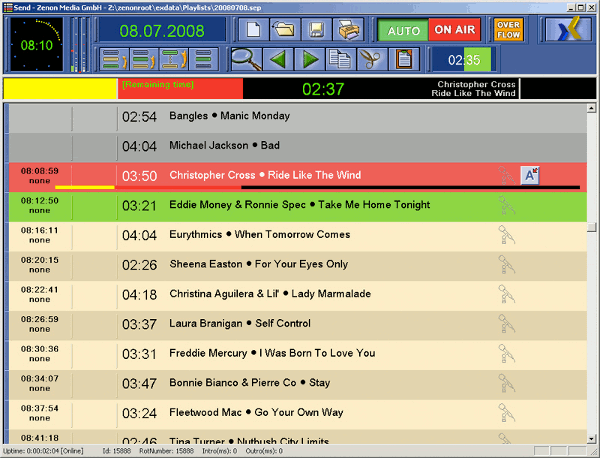 SEND exécute toutes les fonctions de diffusion selon le mode de transmission choisi (manuel ou automatique). En mode manuel, le déroulement de l’émission est classique avec le lancement des titres sur les deux tranches audio. L’animateur démarre le titre suivant en activant le fader de la console de mixage. Les compteurs (intro, temps restant et débordement…) sont actualisés en temps.